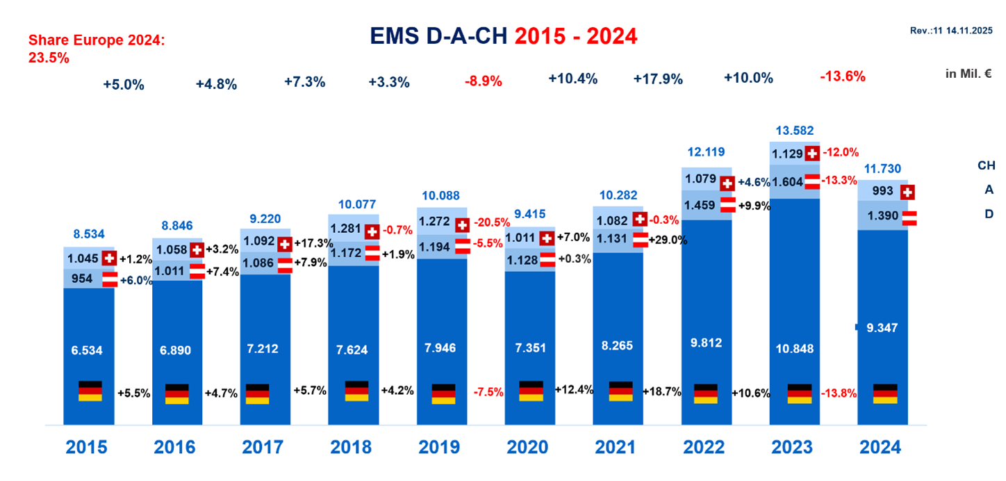 Die letzten beiden Jahre waren von einer hartnäckigen Rezession in der Komponenten- und EMS-Branche geprägt, was sich im Vorjahresvergleich anhand von Rückgängen in Höhe von -12,4% (EMS, per 30.06.2025; Quelle: in4ma) bzw. -16,3% (Distribution, zweites Quartal 2025; Quelle: FBDI) nachvollziehen lässt. Erweitert man diesen Suchzeitraum wird ersichtlich, dass im EMS-Bereich der Umsatz im DACH-Raum per 31.12.2024 gar um insgesamt 3,21% tiefer liegt, als dies noch per 31.12.2022 der Fall war (Quelle: In4ma):
