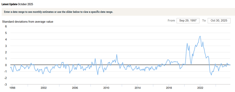Diese Situation scheint sich zumindest im weltweiten Global-Supply-Chain-Pressure-Index nicht niederzuschlagen, der aktuell (per 30. Oktober 2025) mit -0,08% Punkten ein Gleichgewicht an Angebot und Nachfrage ausweist. Dabei sei angemerkt, dass es sich nicht nur um elektronische, sondern um sämtliche Lieferketten handelt.